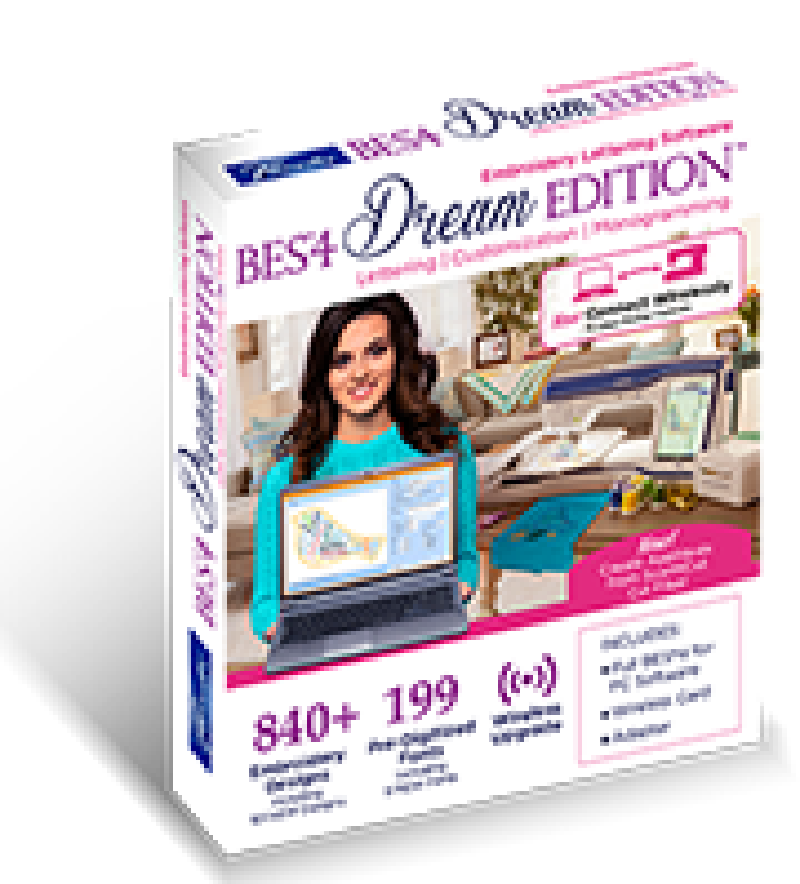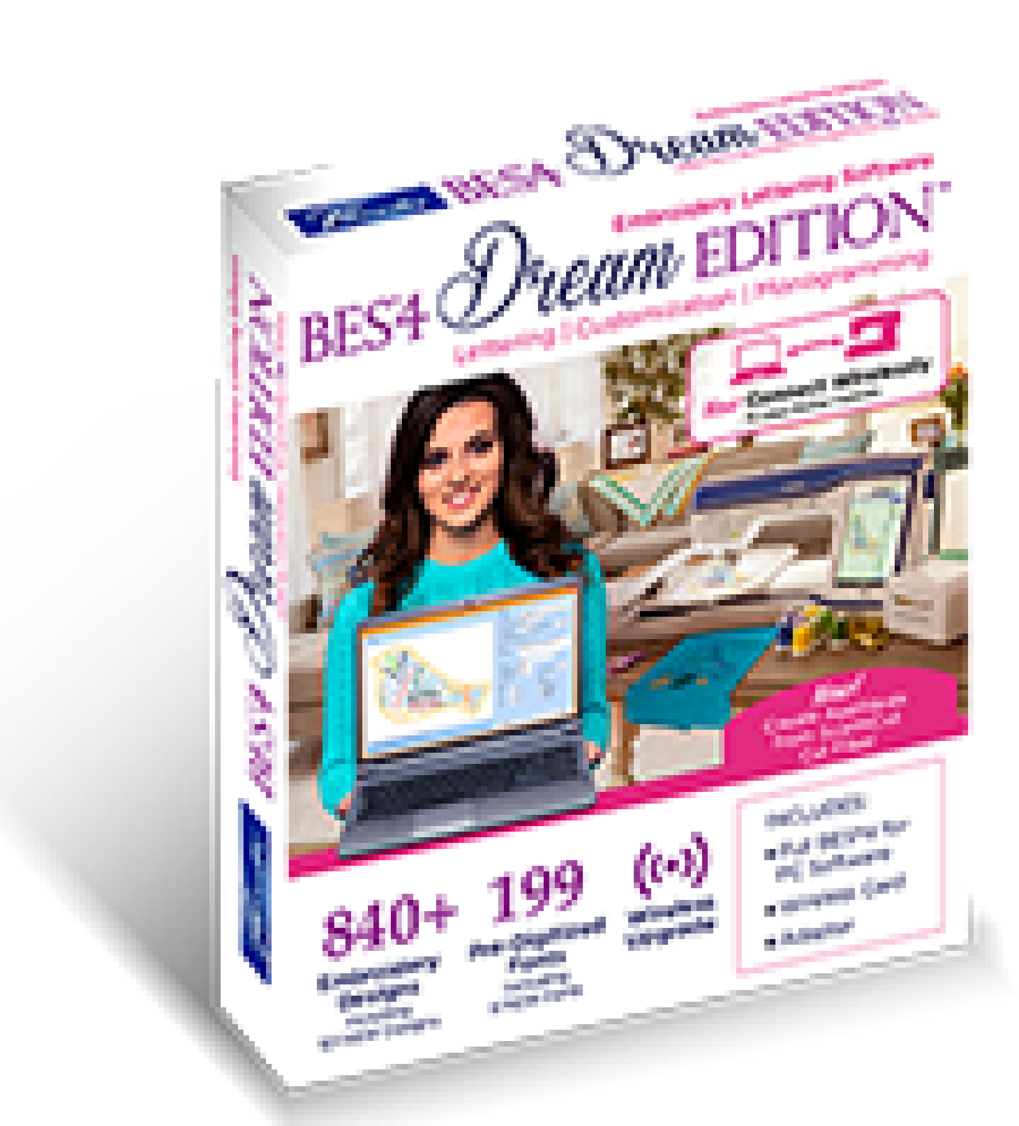 The BES®4 Dream Edition is a full-featured desktop lettering, monogramming and customization PC software with more designs, more fonts, and more creative customizing and editing features than ever before! Plus, it includes a new wireless upgrade kit and convenient BES Cloud® web application for free storage and basic editing capabilities.